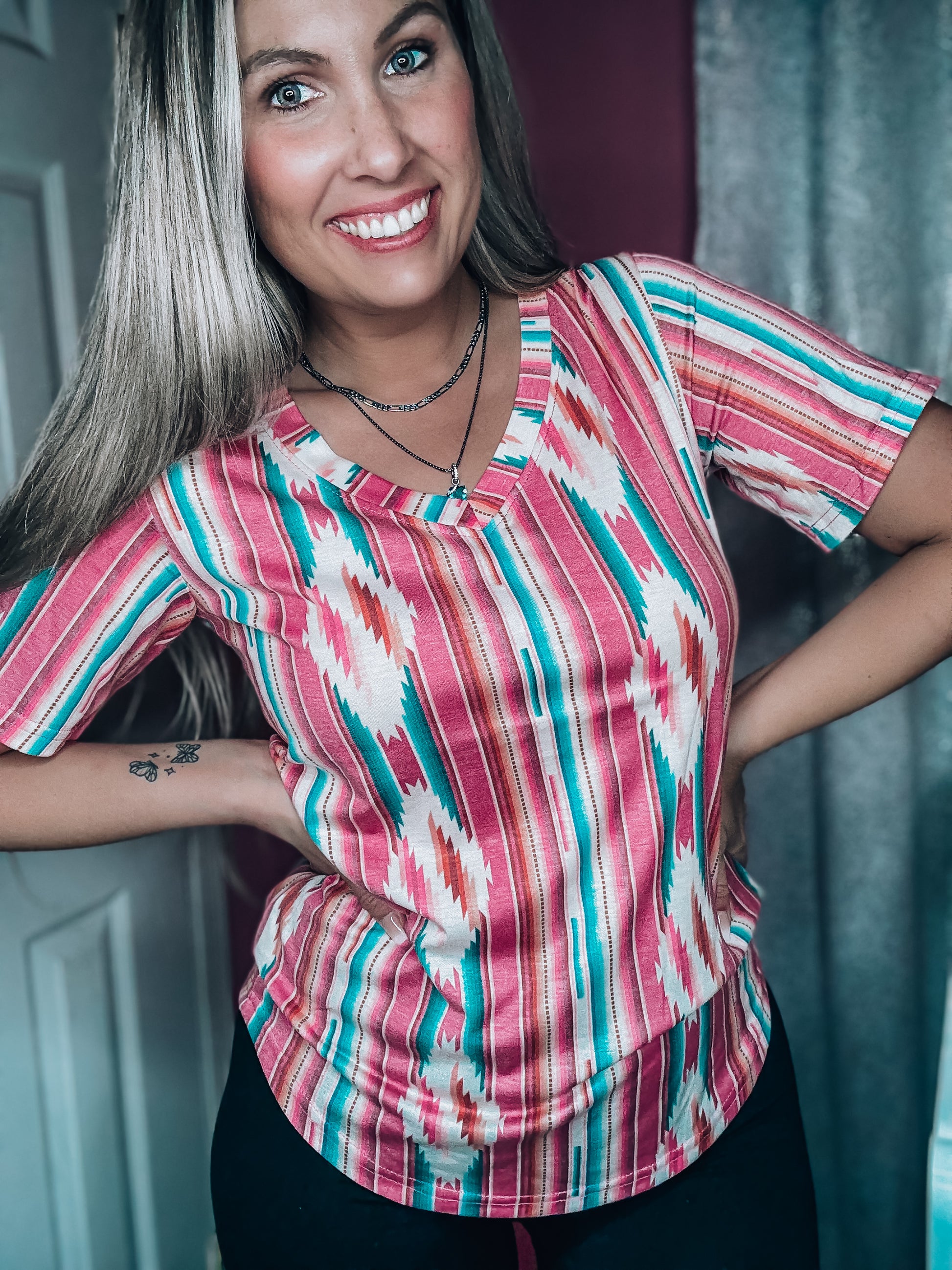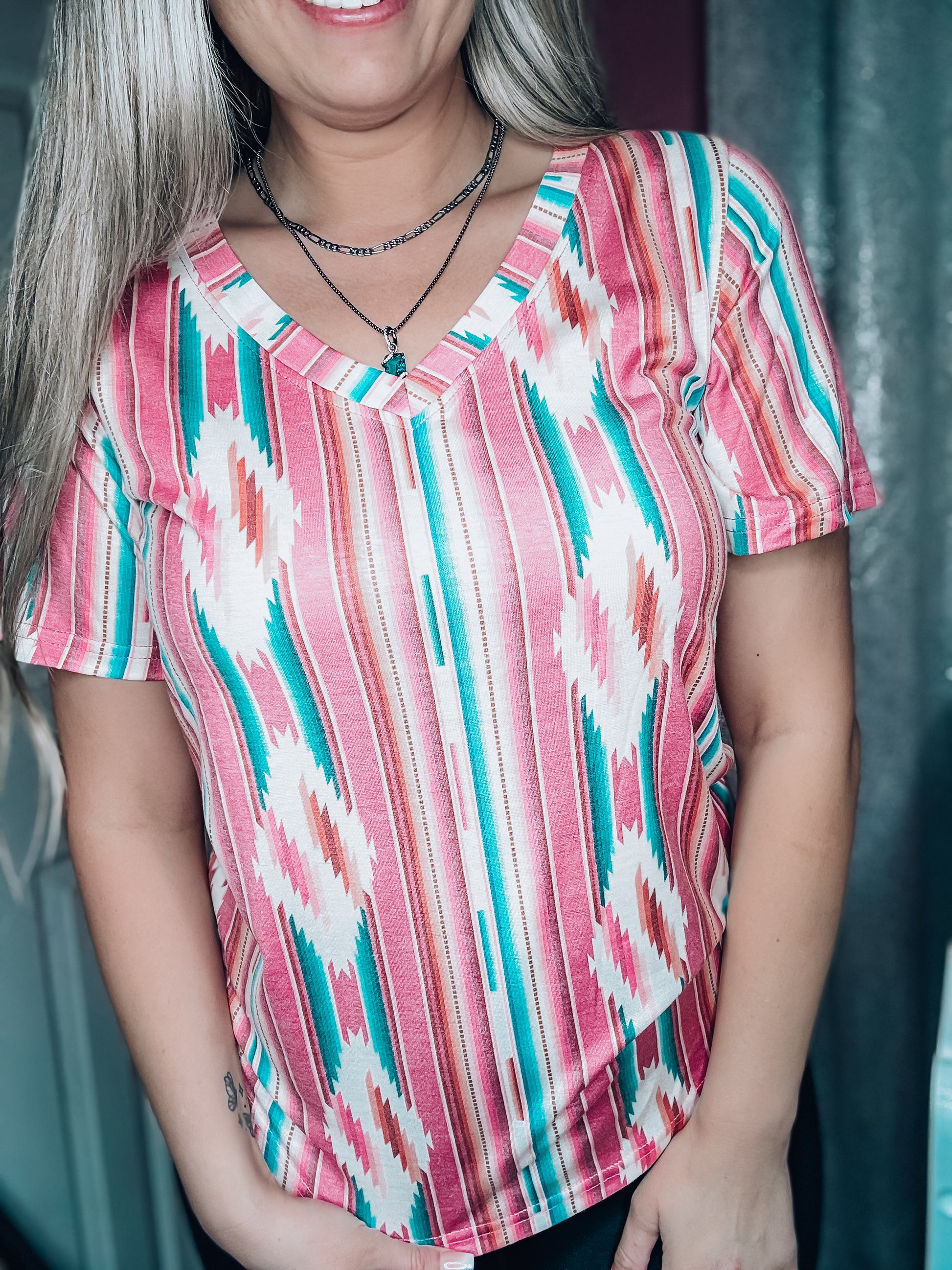 Stay cool and stylish in the Frio River Top! This unique top features a faded v-neck and a striking serape/aztec design that will have you standing out from the crowd. Perfect for any summer adventure, this fashionable piece packs a ton of style into a lightweight fabric, just add your favorite denim and you'll be ready to go!