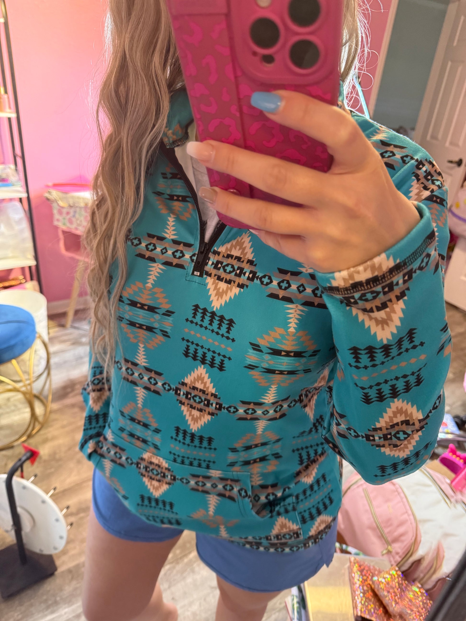 Experience the ultimate comfort and style with our Laramie Kreek Pullover! This stunning turquoise pullover features a mesmerizing aztec print that will make you stand out in any crowd. Stay warm and fashionable with this must-have addition to your wardrobe.
